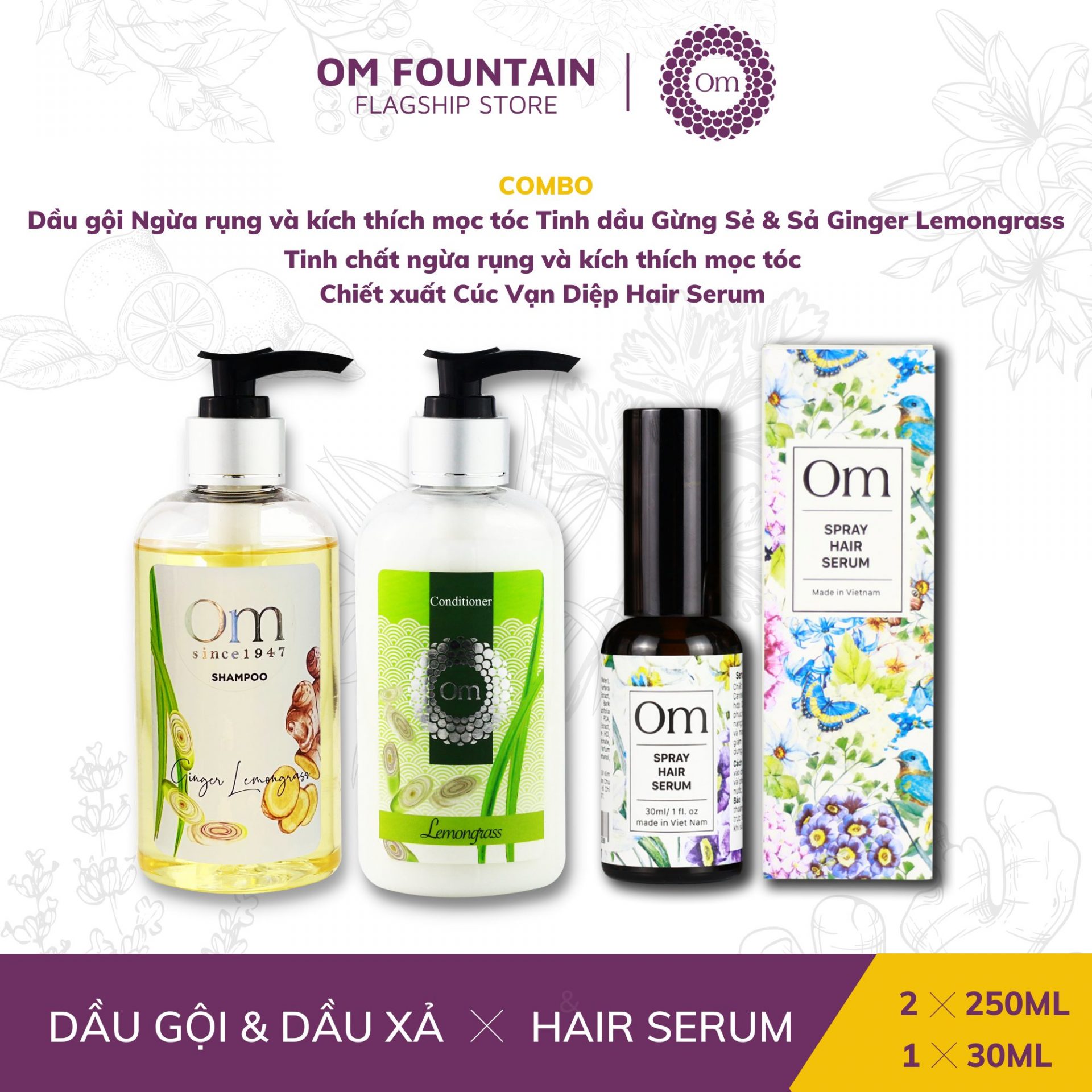 [COMBO 1] DẦU GỘI VÀ DẦU XẢ NGỪA RỤNG VÀ TINH DẦU GỪNG SẺ & SẢ + TINH CHẤT CHIẾT XUẤT CÚC VẠN DIỆP HAIR SERUM 30ML – OM FOUNTAIN