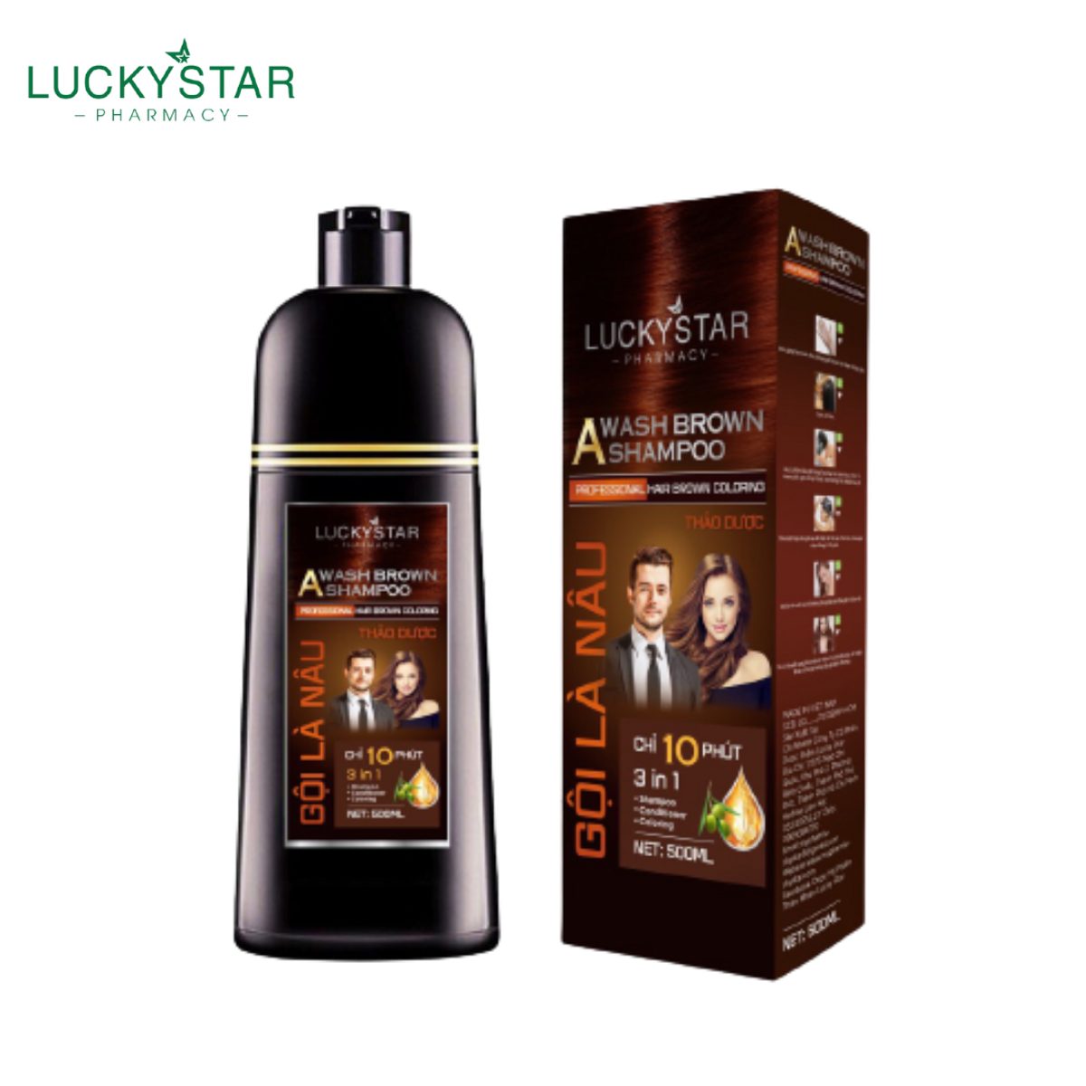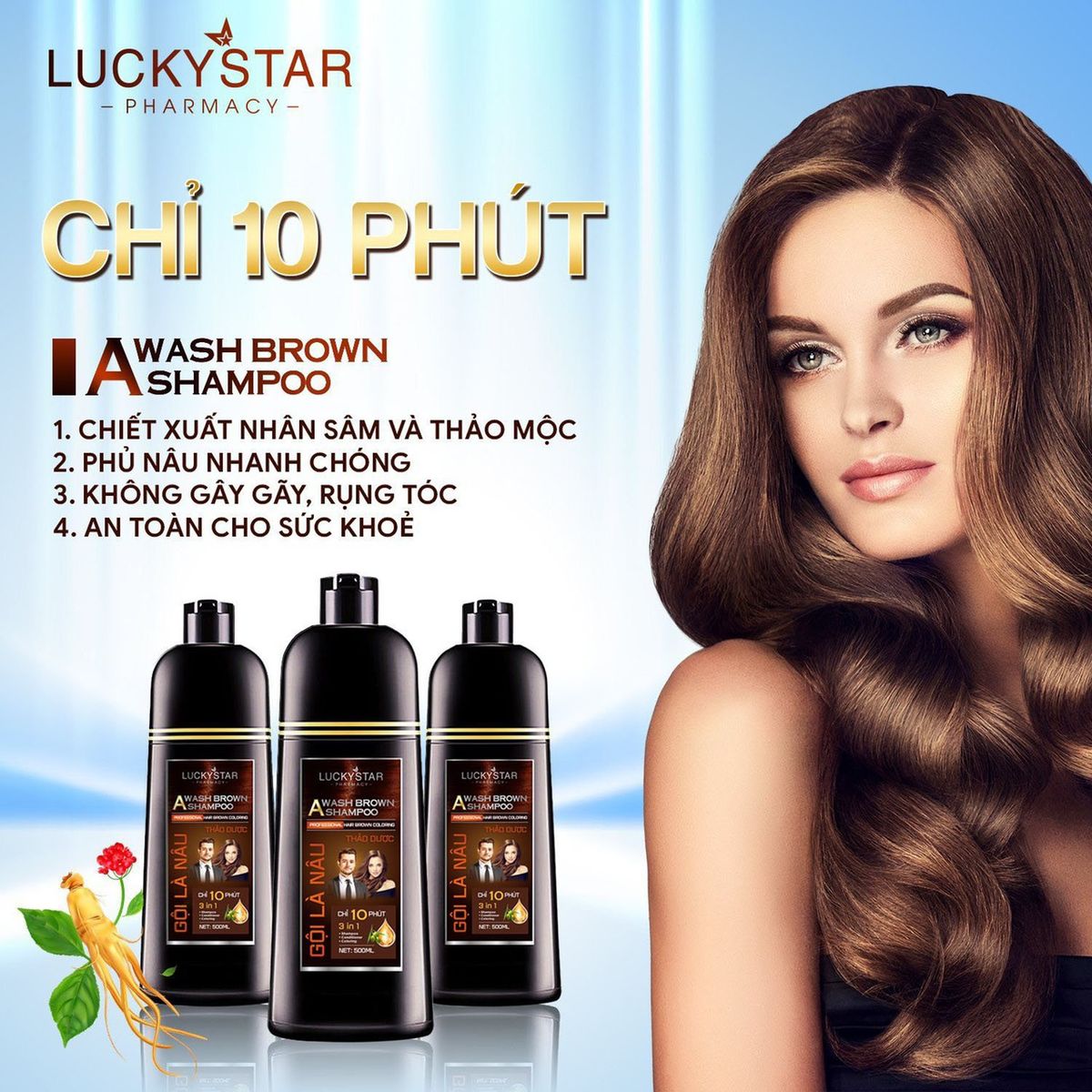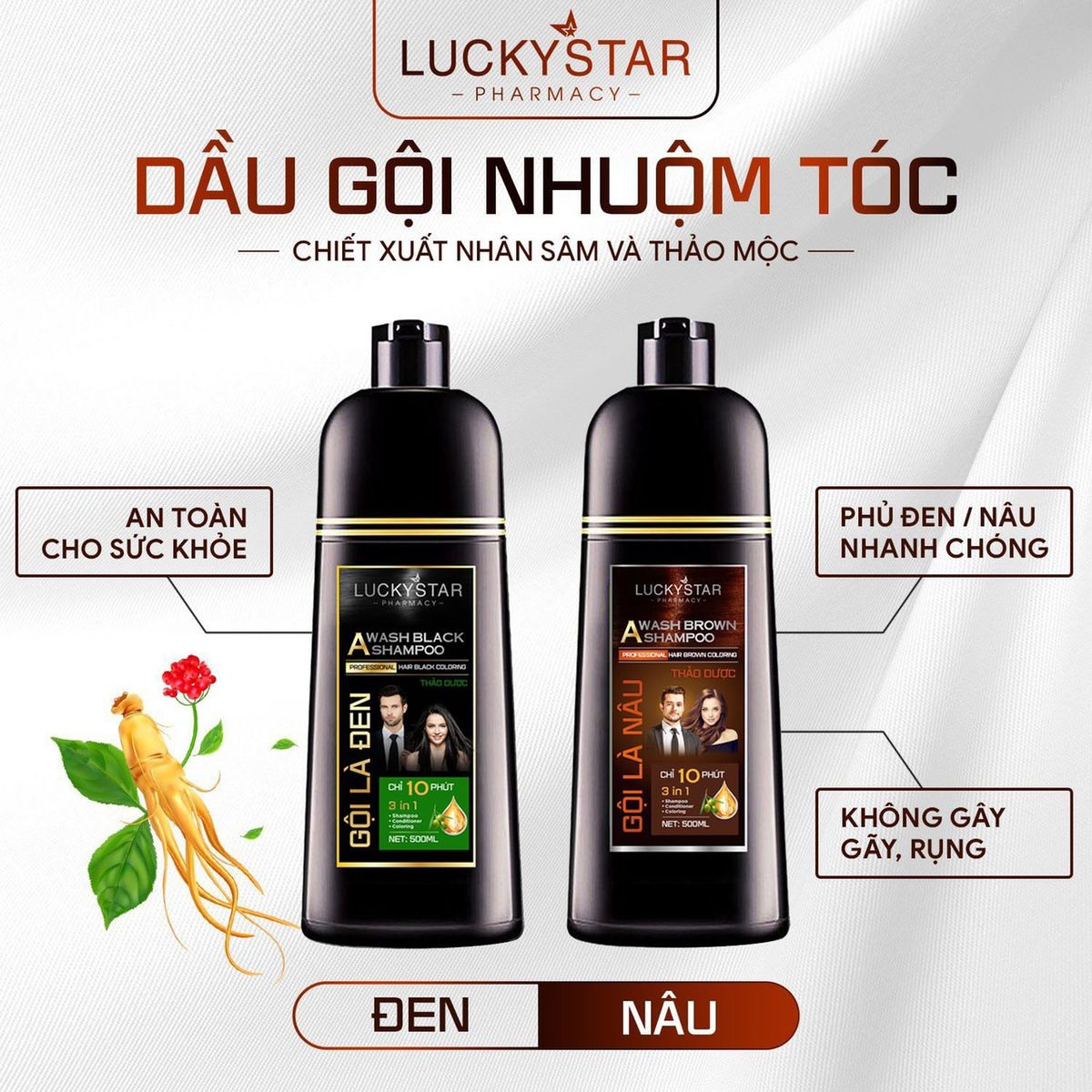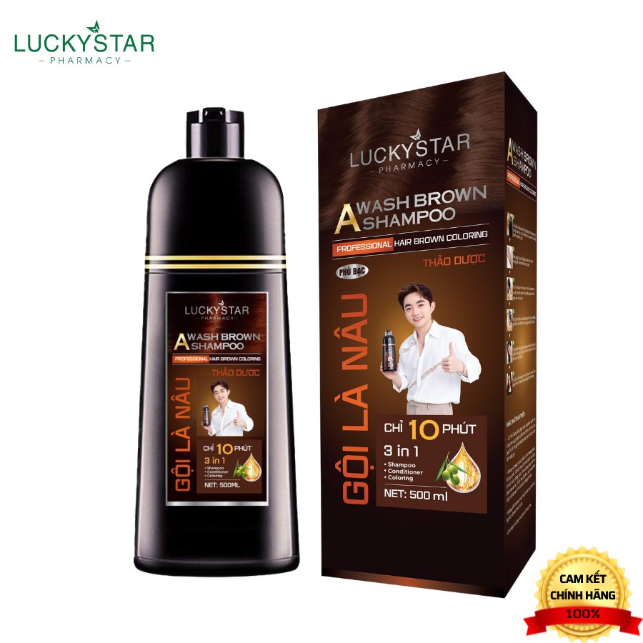 - LuckyStar vừa mang đến cho khách hàng một siêu phẩm giúp phủ bạc mái tóc của bạn mang lại mái tóc nâu lấy lại thanh xuân trong vòng 10 phút. Gội là nâu không bám da, không hoá chất. Thành phần chủ yếu từ thảo dược, có mùi thơm nhân sâm cực kỳ dễ chịu.