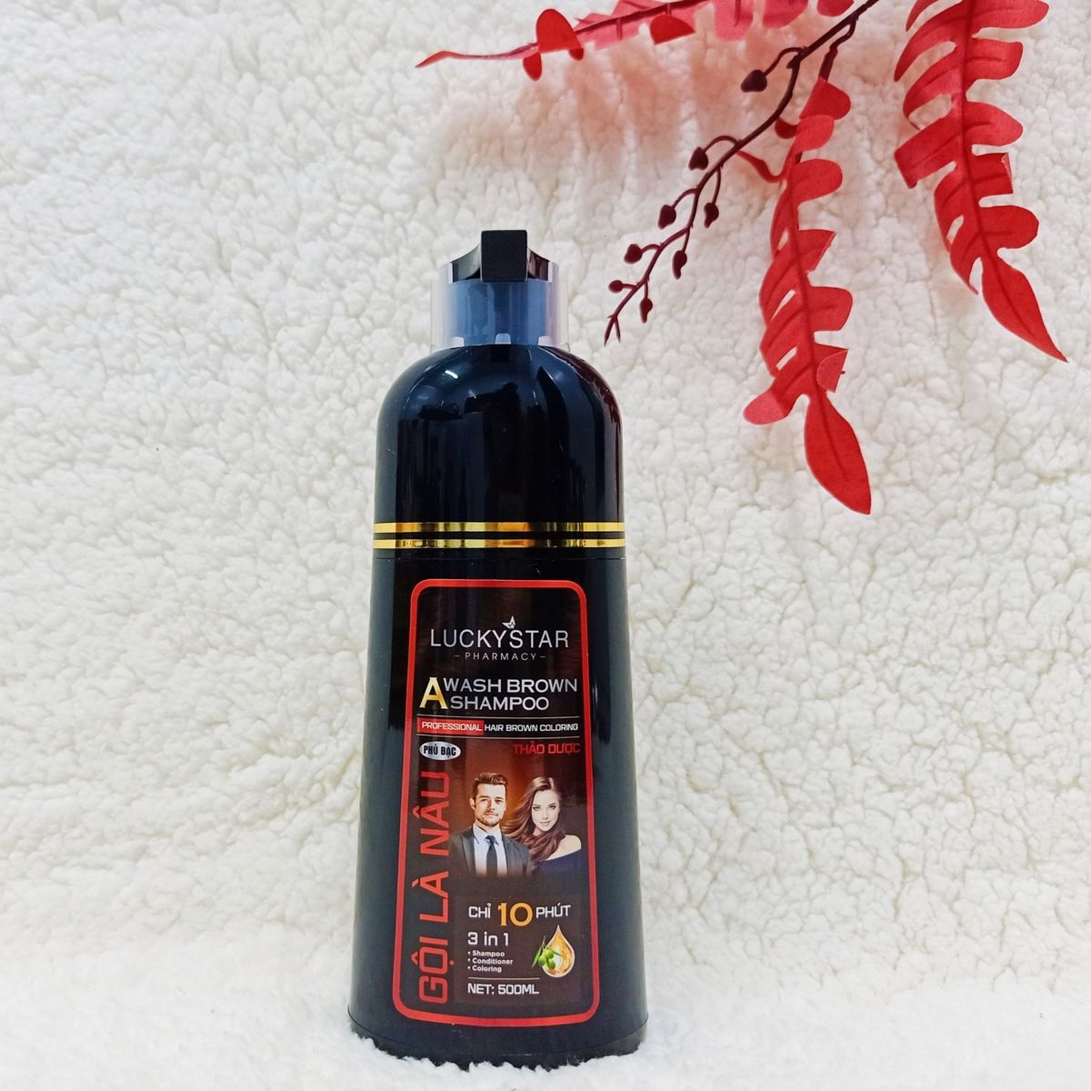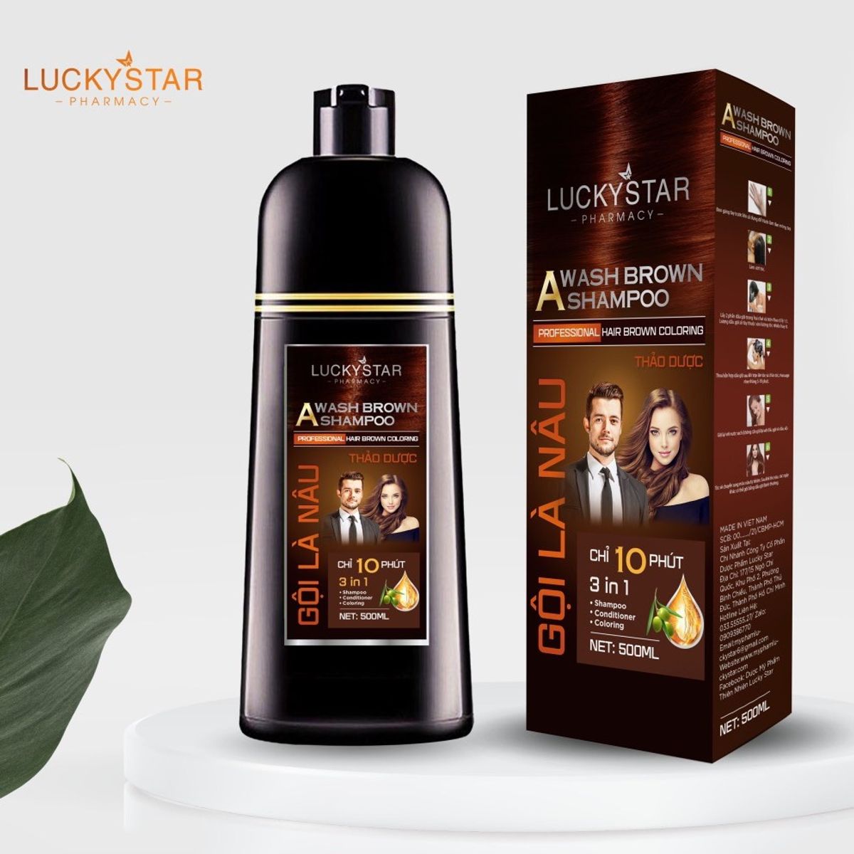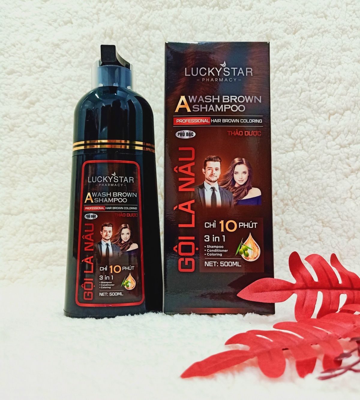 - LuckyStar vừa mang đến cho khách hàng một siêu phẩm giúp phủ bạc mái tóc của bạn mang lại mái tóc nâu lấy lại thanh xuân trong vòng 10 phút. Gội là nâu không bám da, không hoá chất. Thành phần chủ yếu từ thảo dược, có mùi thơm nhân sâm cực kỳ dễ chịu.