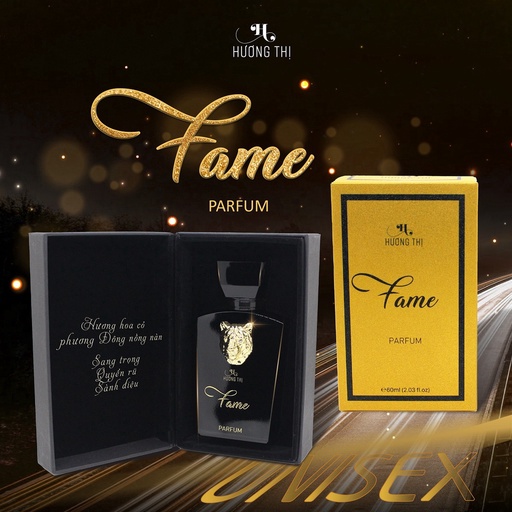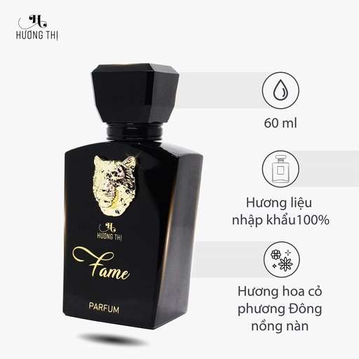- Lấy hình tượng chú hổ chúa sơn lâm dũng mãnh, cũng chính là con giáp của năm 2022 – Nước hoa Unisex Fame Hương Thị là dòng nước hoa dành cho cả nam và nữ mang đến hương thơm sang trọng, mạnh mẽ, khí chất và đầy cuốn hút. Phù hợp cho cả quý ông thanh lịch và cả quý cô cá tính (Unisex Parfum).