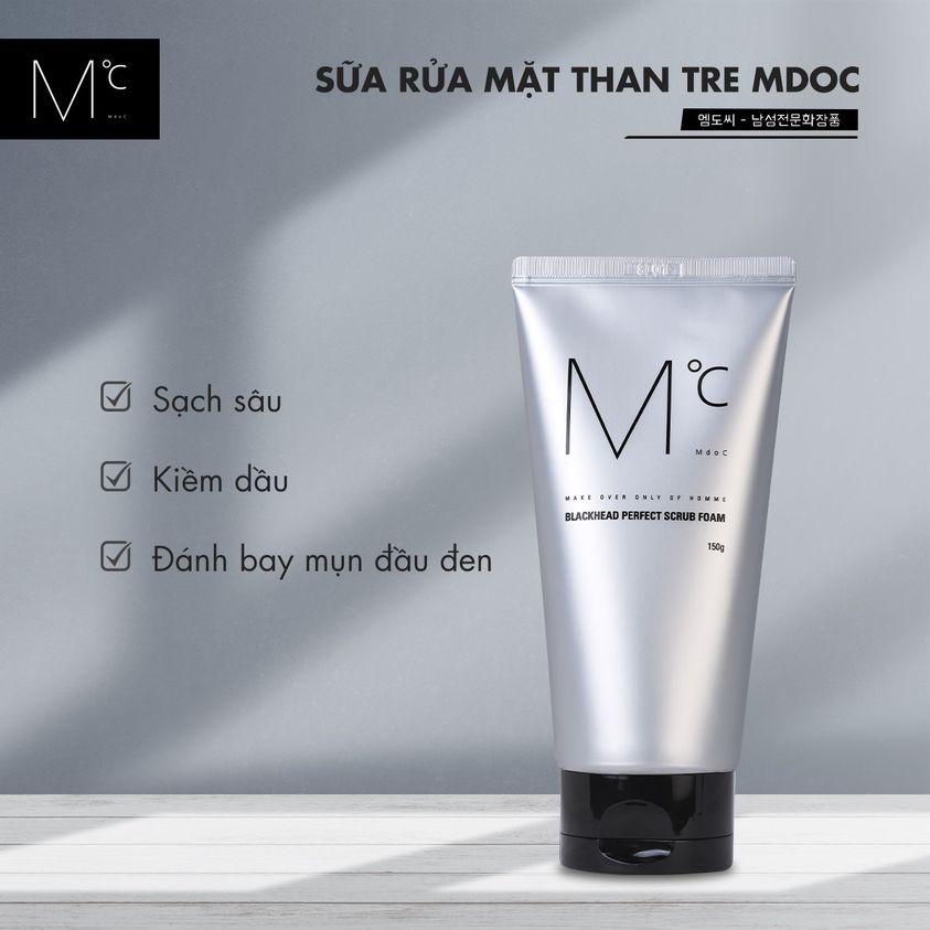 Sữa rửa mặt cho nam MdoC Blackhead Perfect Scrub Foam 50g kết hợp tẩy tế bào chết, loại bỏ mụn đầu đen. Với 4 tác dụng kép sử dụng các hạt tẩy tế bào chết tự nhiên và bột than tre giúp làm sạch hiệu quả không chỉ lớp trang điểm mà còn giúp loại bỏ bụi mịn, tế bào chết và mụn đầu đen trong lỗ chân lông.